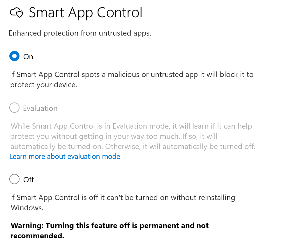| Evaluation | Default setting for a newly installed device. With the Evaluation State, Windows will determine if you are a good candidate. For Microsoft, a good candidate is someone who doesn’t get their applications blocked all the time by SAC. If you are a good candidate, it is automatically enabled. If not, it is turned off. Smart App Control does not block anything while it is in evaluation mode. Once the evaluation is complete, or if you manually switch Smart App Control On or Off, you won’t be able to return to evaluation mode unless you reinstall or reset Windows 11. |