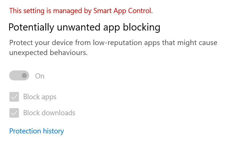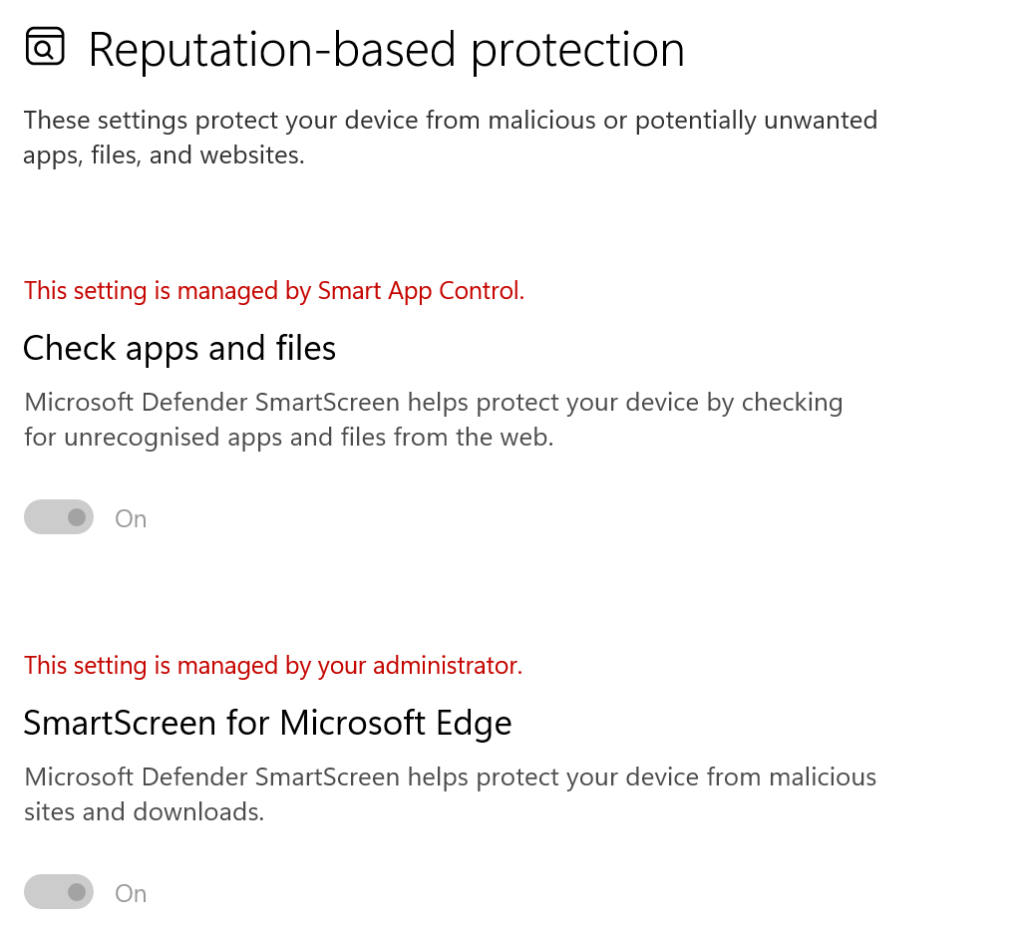 When SAC is switched on, other already known “Reputation-based protection” components are automatically activated. This is indicated by the “This setting is managed by Smart App Control” remarks.