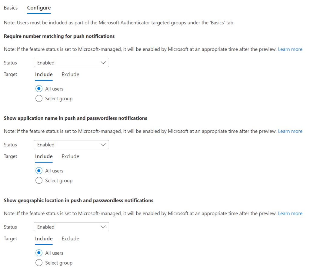 The default configuration is Microsoft Managed. This means that you give Microsoft control over when the feature is activated. For Require number matching for push notifications this would be the end of February 2023. If you set the features to Enabled, you can already roll out and pre-test them for pilot users.