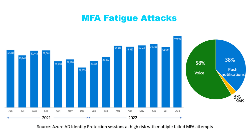 A social engineering technique called MFA fatigue, also known as MFA push spam, is on the rise as attackers use it to bypass multi-factor authentication checks. Many times, repeated MFA notifications are triggered and the person targeted is contacted to accept the MFA request. After all, users are so overwhelmed that they accidentally click the Approve button or simply accept the MFA request to stop the flood of notifications on their device. Microsoft studies show that about 1% of users accept a simple approval request on the first try and that attacks using push notifications, voice confirmations, and SMS as the primary culprit are trending up. That’s why it’s so important to require users to enter the information on the login screen and have more context and protection.