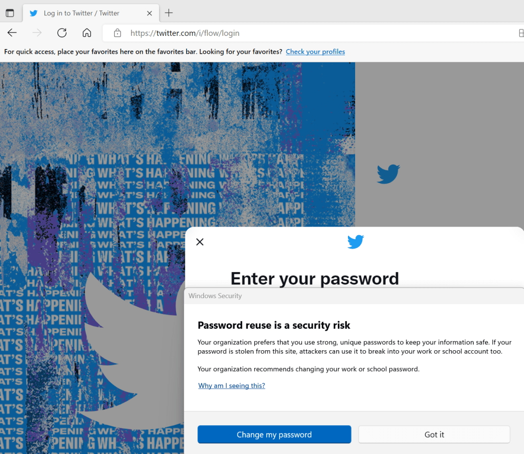 The “Warn me about password reuse” feature could be tested successfully by entering my windows password in the Twitter login screen.