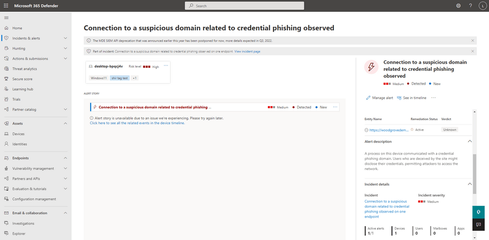 Phishing alerts in the Defender for Endpoint (MDE) portal