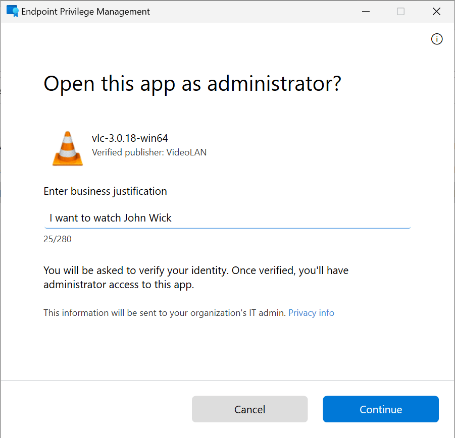 So we start the VLC installation setup again with “elevated access”. This time we are asked for a business justification as defined in our policy.