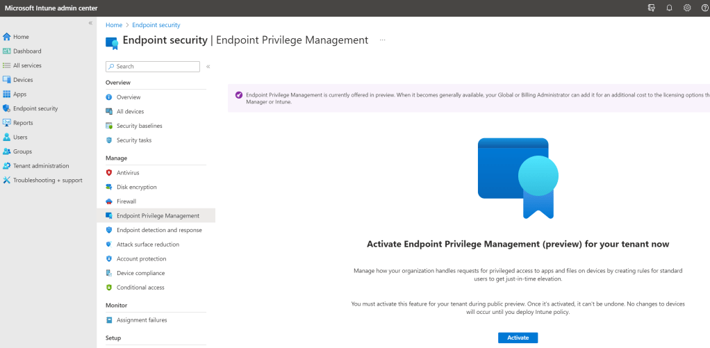 Microsoft Intune admin center (https://intune.microsoft.com) – Endpoint security – Endpoint Privilege Management – Activate