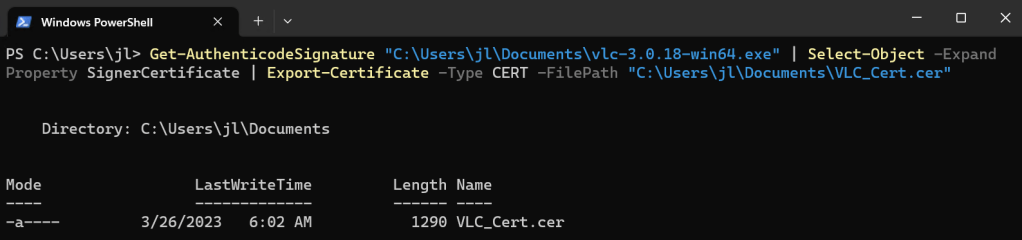 Get-AuthenticodeSignature "provide your exe file path" | Select-Object -ExpandProperty SignerCertificate | Export-Certificate -Type CERT -FilePath "Exportpath\Name.cer"