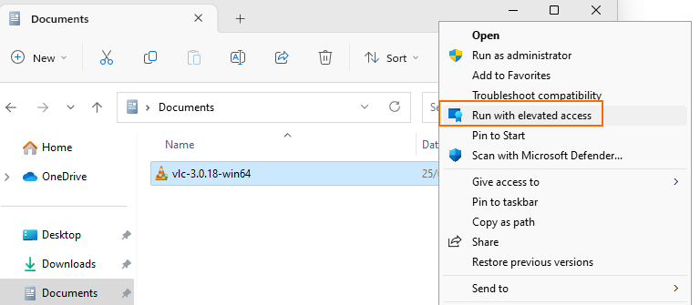 If we now try to start the VLC installation setup with “elevated access”, this attempt will fail because we have not yet created an approval policy for VLC.