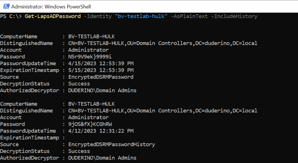 Get-LapsADPassword -Identity "Your DC" -AsPlainText -IncludeHistory