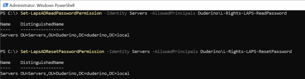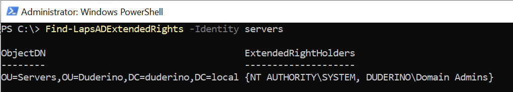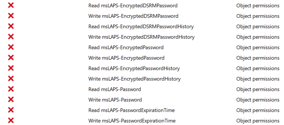 | Set-LapsADReadPasswordPermission | Grant permission to read the Windows LAPS password. | msLAPS-EncryptedPassword (read) msLAPS-EncryptedPasswordHistory (read) msLAPS-Password (read) msLAPS-PasswordExpirationTime (read) |