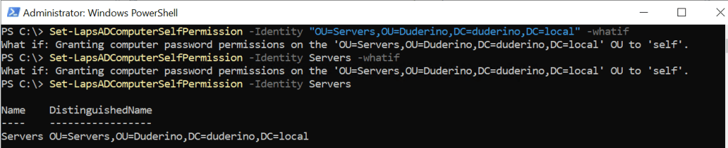 Now we have to give our devices write permissions to their own (SELF) Windows LAPS password attributes. These permissions can be set using the Set-LapsADComputerSelfPermission PowerShell cmdlet. This sets inheritable permissions for desired organizational unit (OU) in which our devices are located.