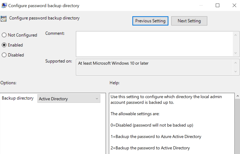 To activate Windows LAPS you basically only have to configure the password backup directory setting: