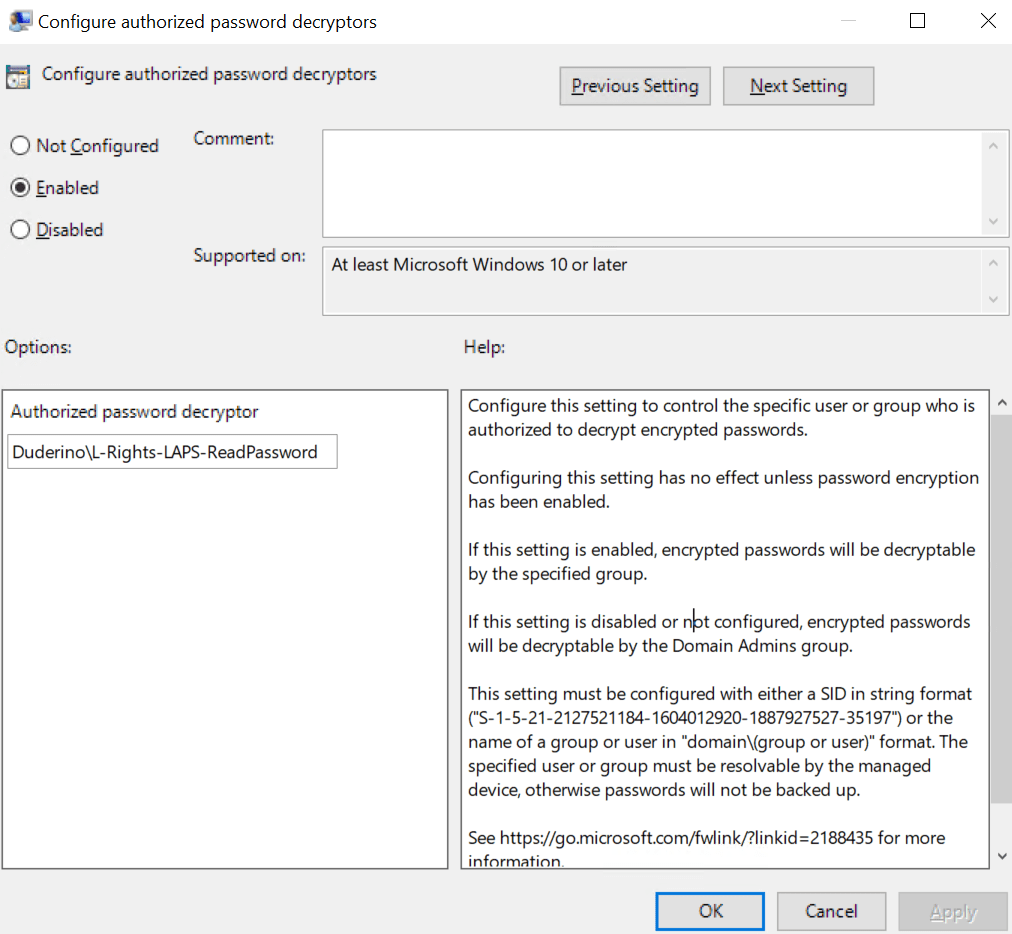 | Configure authorized password decryptors | Use this setting to configure the name or security identifier (SID) of a user or group that can decrypt the password that’s stored in Active Directory. This setting is ignored if the password currently is stored in Azure. If not specified, only members of the Domain Admins group in the device’s domain can decrypt the password. If specified, the specified user or group can decrypt the password that’s stored in Active Directory. |